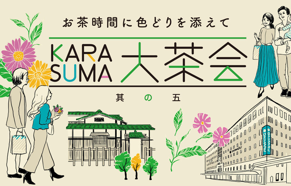 今年の秋で5回目を迎える、「KARASUMA大茶会」。大丸京都店がプロデュースするこの企画は、四条烏丸を舞台に、多様なお茶の楽しみ方を通じて人と町をつなぐ「大茶会」イベントです。大丸京都店をメイン会場に近隣のお店も加わって、今年も恒例のお茶の祭典を開催します。 今回はお茶と組み合わせることでさらに豊かな時間をもたらしてくれる、 お花や美味しいお茶請け、テーブルウエアなどの"色どり"にスポットをあて、お茶の味や香りだけでなく、 その時間も空間もまるごと楽しむKARASUMA大茶会流のお茶時間をご提案します。