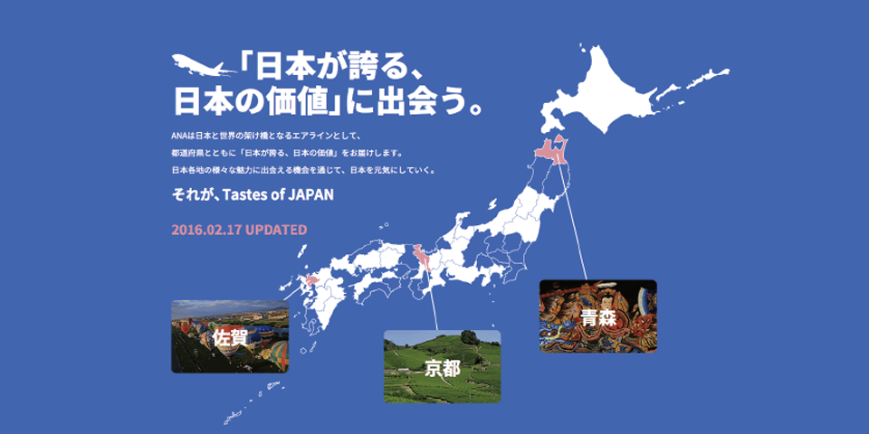 ANA集團自平成25年(2013年)9月起,實施「Tastes of JAPAN by ANA」計劃,向日本全國及海外的客人介紹日本各地的獨特魅力。此計劃以3個月為一輪,每次挑選3個都道府縣,依序針對日本全國共47個都道府縣推出特輯。平成25年(2013年)的3月到5月,針對曾榮獲世界人氣城市排名第一位的京都推出了特輯。